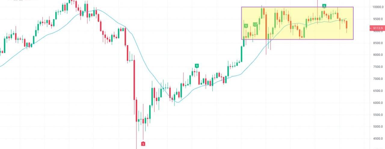 上期周報中我們在行情分析里給出當前行情走勢為$8700-$10000的箱體震蕩,過去一周,BTC現貨價格走勢仍在該震蕩區間內波動,呈現出先揚后抑的形態,截圖來自OKExBTC/USDT現貨價格日K線圖,6月11日幣價遇阻回落,上周五跌破了MA20,經過周六日的小幅整理后,本周一行情延續下跌模式,盤中幣價跌破了9000美元整數關口,最低觸及$8910.4,距離箱體下軌$8700仍有300點的下跌空間。