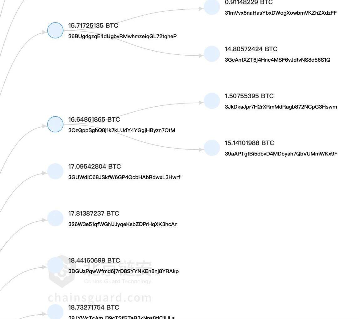 注:以上比例根據各交易所流出到已確定主體地址中的分布計算,排除了未確定主體的地址和獨立地址,即在交易所流出的所有比特幣中,相關主體的實際占比會更小一些。安全和數據要聞方面:2016年Bitfinex被黑地址多為社區網友推演分析北京鏈安鏈上數據分析專家SXWK表示,近期媒體多次提及的Bitfinex被盜BTC轉移,其相關地址源頭大都為事件發生后,比特幣社區網友根據時間線的推演,大都在reddit進行討論。如今天最新的一筆轉賬,其來源主要為當時Bifinex的熱錢包地址之一的3NMkeWidzL7MQbrdMR9m7guANcNJofxyJD,它于當地時間2016年8月2日將416枚BTC歸集到地址1Bf5aQqsd7gtjLysYQKtqQ3yBLDHZogouA,由于Bifinex于當地時間2016年8月3日宣布被盜,所以從時間線上被分析者認為這是黑客的轉賬交易之一。類似地址當時推演出很多,但是相關交易哪些是黑客盜幣行為,哪些又可能是交易所發現問題后的緊急轉賬處理尚不明晰,同時網友分析出的被盜交易涉及的BTC總額度距離Bifinex公開的119,756枚被盜BTC還有相當距離今天的交易實際上是這416枚BTC被拆分為20筆UTXO,最大的為33BTC,最小的為15BTC,目前部分BTC也正在進行進一步小額的拆分轉賬。