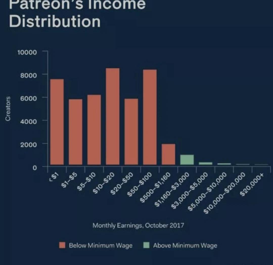 SaifedeanAmmous在Patreon的頁面今年2月,Patreon推出了一項小額貸款計劃PatreonCapital,計劃為Patreon平臺上的創作者提供資金借貸服務,讓創作者支付一定費用就可以獲得未來的收入,可貸款金額規模大約是創作者在平臺收入的50~100倍。該功能將為Patreon多樣化營收來源,并為Patreon提供更具持續性發展的業務。如今Patreon已經獲得成功,這一網站已經成為了新型網絡經濟的基石。數據顯示,Patreon上每年有超過300萬的粉絲群體給10萬內容創作者支付約5億美元的資金。該公司總融資金額約1.65億美元。2019年支付金額達到5億,這是上一年支付額的1.7倍。總體上看,Patreon平臺的數據確實很好看,但對于創作者而言,需要落地實處的是,到底有多少內容創作者通過該平臺賺到錢了呢?
