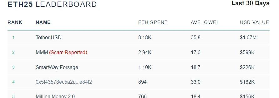 資金盤“占領”以太坊了?ethgasstation數據顯示,過去三十天里,以太坊手續費消耗排名前五的智能合約里,有三個都是資金盤。而其中排名最靠前的合約名為MMM。