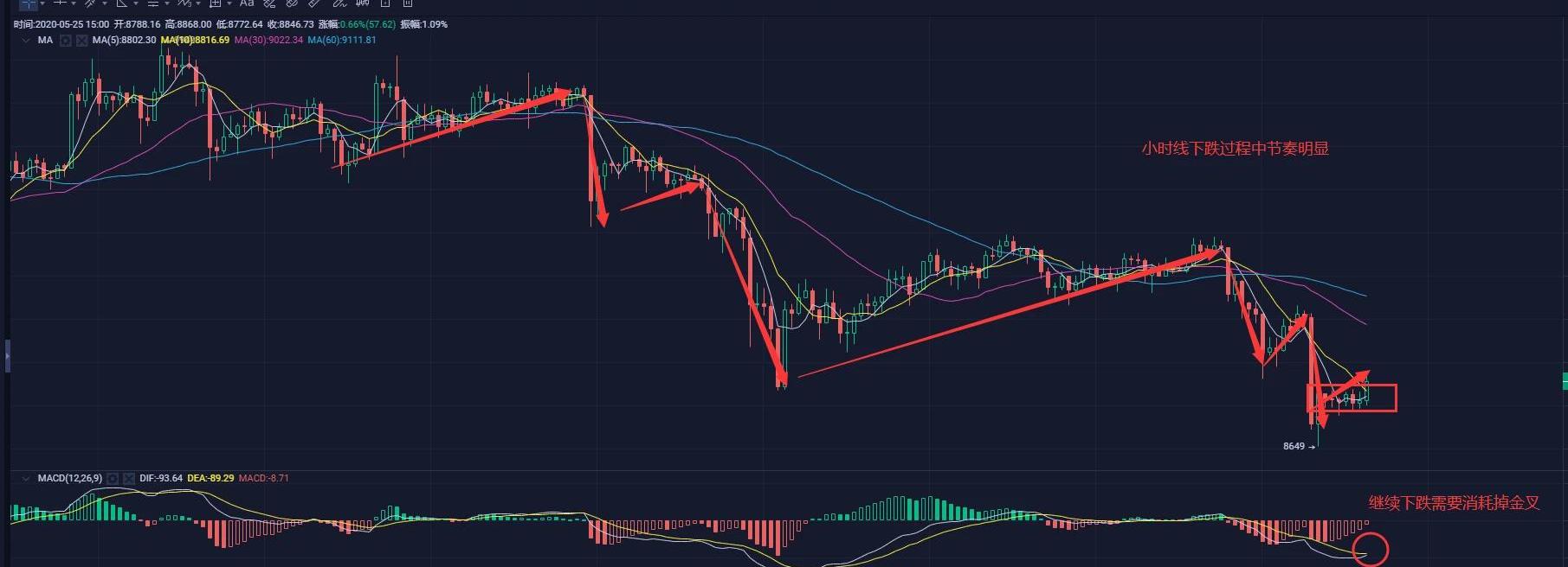 XRP/HKD-0.32%普通幣圈投資者一直以來的邏輯是:比特幣是稀缺的,總量只有2100萬枚,加上POW挖礦減半的發行機制,比特幣的供應量是通縮的。但其需求卻隨著區塊鏈和數字貨幣市場的發展、宣傳和推廣,與日俱增,因此比特幣的價格只會越來越高,現在不買,以后拍斷大腿。從商品供求關系看,這個邏輯沒有一點兒問題。但如果疊加了金融屬性的玩法,情況則有所變化。加密評級機構韋氏評級發推稱:“比特幣的供應量要高于2100萬枚。交易所可對任何加密資產的現有供應進行杠桿化,就像銀行可對法定貨幣的供應進行杠桿化一樣。”也就是說,對于機構,即使在之前沒有屯夠足量的BTC,但只要是金融市場,巨頭們便有很多方法去獲得BTC,而不是靠一味地買入。比如通過合約等衍生產品,不需要實物BTC,通過資金來操縱幣價漲跌,收割市場多空頭的過程中,便獲得了足夠多的比特幣籌碼。之前的比特幣供應量是被挖礦產業鏈控制,因為他們掌控了新增比特幣的供應,對比特幣擁有天然的定價權。但現在情況在逐步變化,雖然還有幾百萬枚BTC通過挖礦在流入,但市場上流通了大量的比特幣,比特幣的定價權在這次減半后,已經由礦工群體轉移到了市場本身。而能影響市場的,一個是交易所,另一個是資金實力雄厚的莊家群體。對于他們來說,因為自身實力強大,擁有遠大于普通投資者的力量,通過各類金融市場規則和玩法,實現降維打擊,便能達到收割普通散戶的目的。因此,像以往的邏輯“機構進場,肯定要買BTC,BTC價格鐵定要漲”的邏輯,并不一定正確,只是比特幣價格上漲的必要而非充分條件。我們在幣圈投資交易中,不止是想著如何賺錢進而盲目操作,更重要的是要認識到金融市場的本質,摸清這個市場的游戲規則和真相。簡單說,加密貨幣市場是信仰游戲,因為信仰,所以相信價值,但其背后是缺乏真實價值支撐的。同時,加密貨幣市場也是博弈和概率游戲,行情在某一點位的漲跌是隨即概率、無法預測,莊家和散戶是對賭關系,資金的目的是逐利,注定了少部分賺錢、大部分人虧錢的結果。本就處于不利地位的散戶投資者們,唯有了解市場規則,敬畏市場,提升自己的認知和學習能力,才能躲過一些坑,讓自己更頑強的生存下來,只有先生存下來,才有賺錢的機會。我們要明白一個底層的邏輯是:認知能力決定了你的財富水平,我們永遠賺不到超過自己認知范圍之外的錢財。關于認知提升,可以參考我之前的文章《交易的四道門,你在哪道門之內?》,值得反復閱讀和思考。回到行情上,比特幣前兩周9800-10000美金的多空爭奪戰似乎就在昨日,讓人覺得1萬美金只是一個開始,莊家不套人不割人,幣價肯定飛起。但現在,比特幣1萬美金卻成了較強壓力,市場下跌趨勢日漸強烈。小時線級別,BTC下跌趨勢一目了然:BTC從9800美金跌下來,跌到9350美金,反彈不破9600美金;然后9600跌下來,跌到8800,反彈9300不破;9300跌下來,跌到8600,反彈9000又不破。短時來看,考驗9000美金日內壓力和8700美金日內支撐,強支撐在8000美金區間。