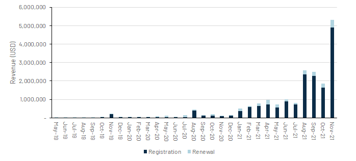 ENS 已經產生了近 2000 萬美元的收入,主要來自于新域名的注冊,而這些收入將歸入 DAO 國庫。