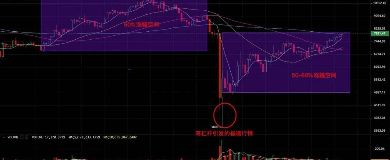 現在呢,如果反彈,能反彈到哪里?馬上臨近BTC正式減半,如果我們參考之前的幾個減半幣ETC、BCH、BSV、DASH的表現,可以得出一個結論:BTC在減半前還有概率反彈,但幅度不會太大,屬于減半概念的行情早已過去,短時間內炒不了多高。從3.12最低點3800美金計算,現在是7800美金附近,4000美金空間,漲幅105%,但這是高杠桿連環爆倉和市場極度恐慌造成的極端結果,并不能代表市場的真實情況。更準確的計算點位應在5000美金,這是極端行情后的止跌區間。按照這個價格計算,離7800-8000美金有2800-3000美金空間,整體也在50%-60%幅度空間。