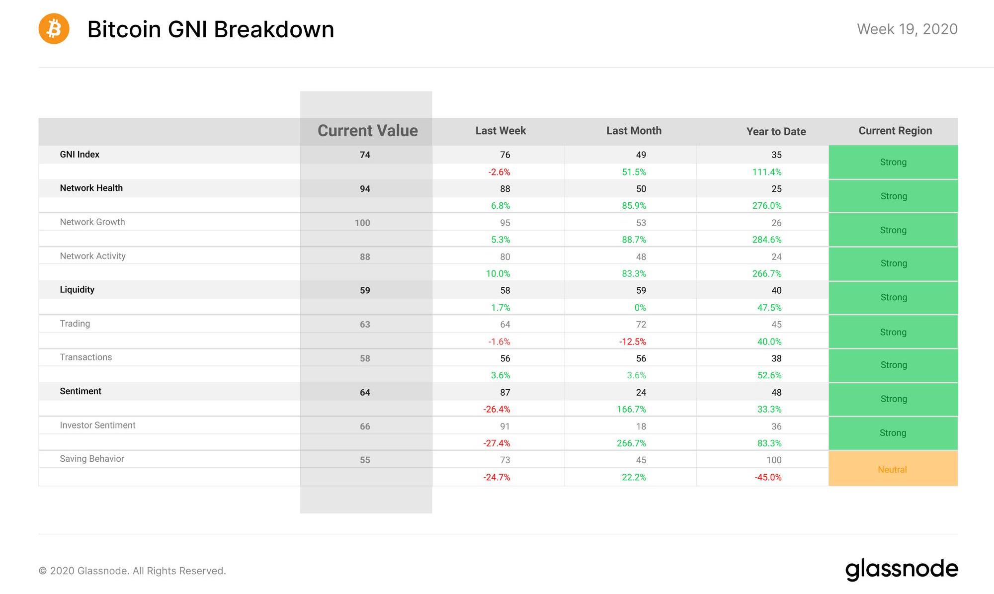 來源:Glassnode自上周以來,GNI已從76點降至74點。但是,一個結合網絡增長和網絡活動的關鍵指標“網絡健康程度”已從88點上升到94點,上升了6點。GNI下降了兩點,主要是因為投資者情緒和儲蓄行為所反映的“情緒”大幅下降,GNI在減半前達到最大值的那一周,下降了23點。比特幣是不穩定的