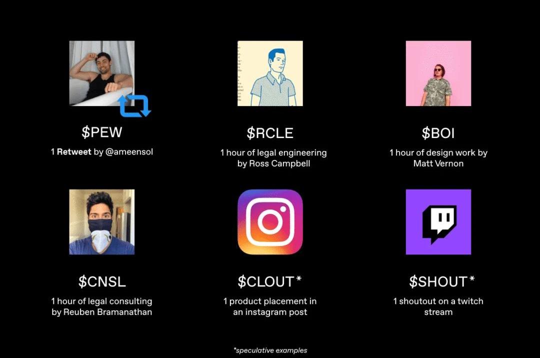 可使用如下這些代幣贖回特定的服務:$PEW:可贖回AmeenSoleimani(SpankChain首席執行官)在Twitter上的1次轉推;$RCLE:可贖回RossCampbell(律師)1小時的法律相關服務;$BOI:可贖回MattVernon(DeFi產品設計師)1小時的設計工作;$CNSL:可贖回ReubenBramanathan(Coinbase前產品和法務負責人)1小時的工作;$CLOUT、$SHOUT等其他用于獲取來自有影響力者的工作的可贖回代幣。可贖回代幣有何新穎之處?