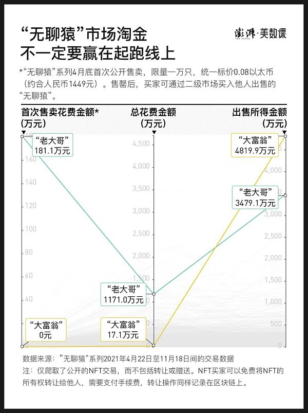 但若僅從“無聊猿”系列明面上的后續多次轉賣交易來看,這1250只猿猴并沒有讓“老大哥”變成市場上最神勇的淘金者。按二手交易的出售金額計算,“老大哥”只憑“無聊猿”賺得了約合3478萬元人民幣,在所有交易者中排第三。最出色的買家,從明面上看,入場遲,后來僅以17萬元的成本,最終收益4820萬元,是賺得盆滿缽滿的“大富翁”(為方便敘述,后文稱他為“大富翁”)。