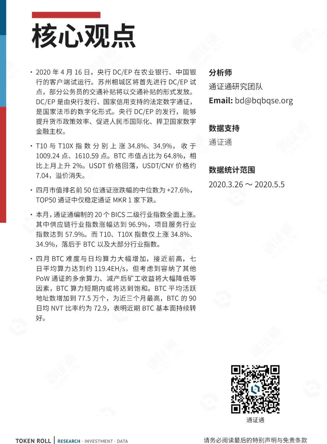 XRP/HKD+0.37%截至2020年5月5日,全球數字通證總市值為2550.72億美元,相比期初上漲672.4億美元,漲幅為35.8%。四月日均成交額為1338億美元,較上月下降173億美元,跌幅為11.4%。2020年4月16日,央行DC/EP在農業銀行、中國銀行的客戶端試運行。蘇州相城區將首先進行DC/EP試點,部分公務員的交通補貼將以交通補貼的形式發放。DC/EP是由央行發行、國家信用支持的法定數字通證,是國家法幣的數字化形式。央行DC/EP的發行,能夠提升貨幣政策效率、促進人民幣國際化、捍衛國家數字金融主權。本月,通證通編制的20個BICS二級行業指數全面上漲。其中供應鏈行業指數漲幅達到96.9%,項目服務行業指數達到57.9%。而T10、T10X指數僅上漲34.8%、34.9%,落后于BTC以及大部分行業指數。四月BTC難度與日均算力大幅增加,接近前高,七日平均算力達到約119.4EH/s,但考慮到容納了其他PoW通證的多余算力、減產后礦工收益將大幅降低等因素,BTC算力短期內或將達到飽和。BTC平均活躍地址數增加到77.5萬個,為近三個月最高,BTC的90日均NVT比率約為72.9,表明近期BTC基本面持續轉好。