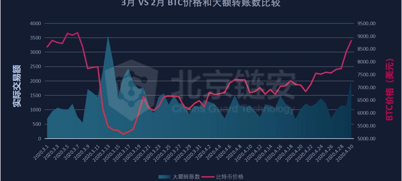 2020年4月的鏈上大額轉賬數為34190次,比2019年3月的45266次下降了24.27%。