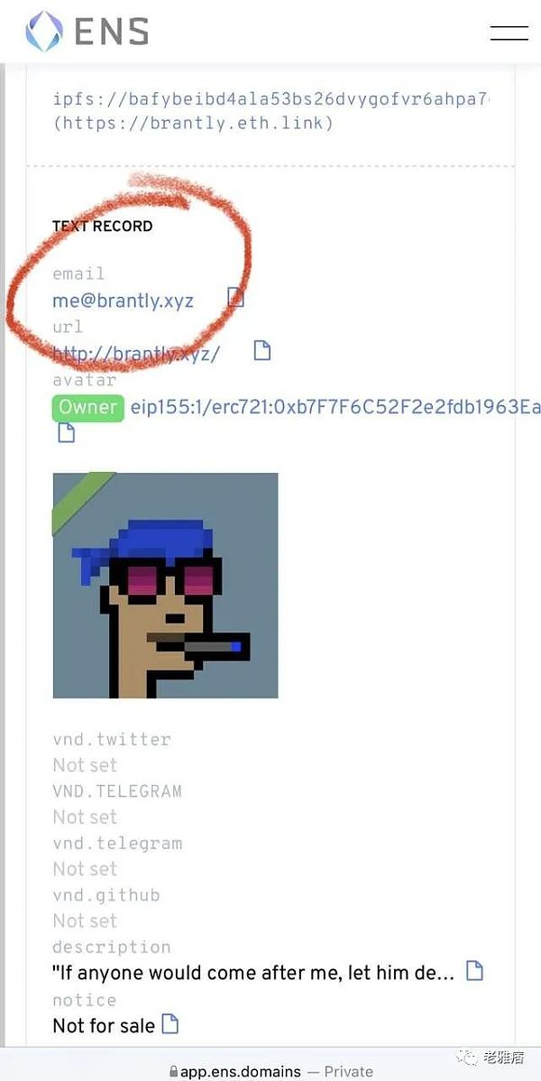 a) 顯示ENS名稱控制著一個電子郵件地址。在一個ENS記錄中,你可以設置一個電子郵件地址。一個具體的例子是brantly.eth,如下所示。