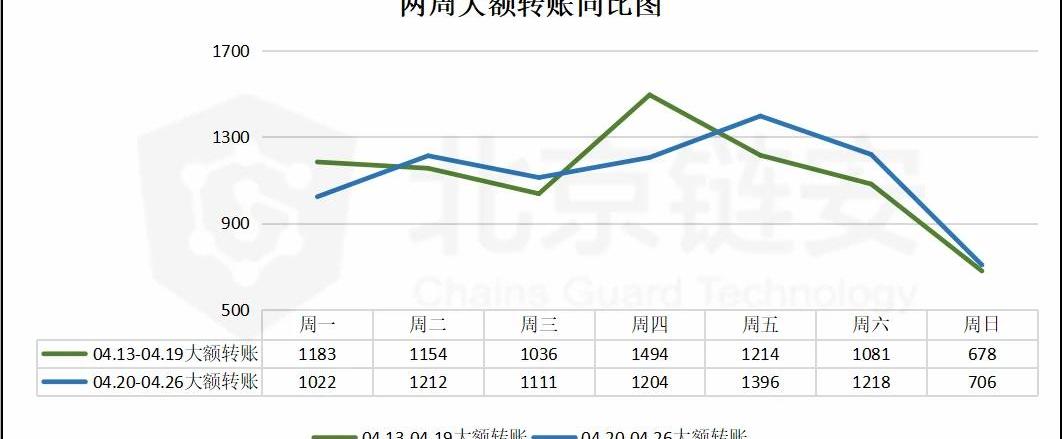 大額轉賬數:04.13-04.19:784004.20-04.26:7869較之前一周上漲:0.37%詳細數據圖如下:
