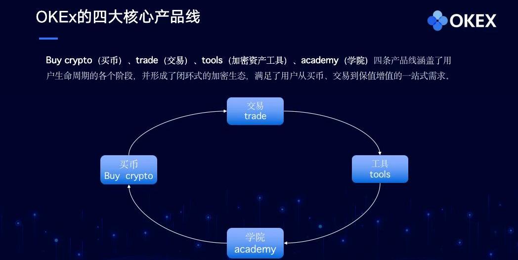 剛才我提到了OKEx四大核心產品線完全是服務于用戶的全生命周期的需求,四大核心產品線分別是買幣、交易、工具和學院,這四大核心產品線能夠充分地形成一個閉環式的用戶對加密資產需求的一個生態,從而滿足用戶從買幣、交易到增值一站式的服務。下面我簡單說一下這四大核心產品線的邏輯,第一個核心產品線是「買幣」,「買幣」幫助全球的用戶便捷地進入加密資產的世界。第二大核心產品線就是「交易」,OKEx應該在目前所有交易所當中產品類型最豐富,也是最全面的交易平臺,它涵蓋了法幣交易、幣幣交易、杠桿交易和交割合約,還包括一些衍生品的期權,而且合約也是是OKEx做了七年的交易產品線,我們目前也支持很多大幣種和小幣種的合約交易,合計起來大概有12個幣種。