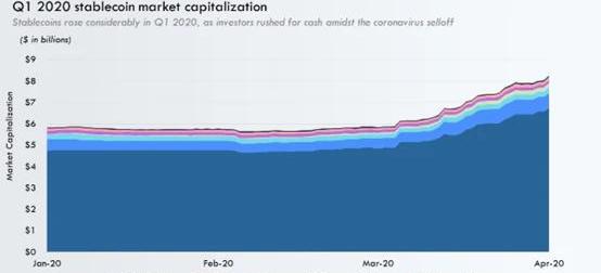 在全球安全資產大轉移和對美元大幅需求的推動下,穩定幣在2020年第一季度實現了爆發式增長,本季度其總市值超過80億美元。事實上,市場對穩定幣的需求非常強勁,以至于2020年第一季度流入該行業的價值比2019年全年都要多。大部分資金流向了Tether,且像USDC這樣的其他穩定幣市場規模也開始大幅增長。