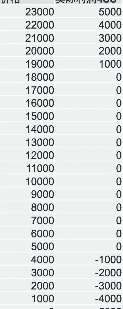 發行人t0pay:MVt0/25000USD,get:MVt0=10000USD,high=18000USD,low=5000USDtnhigh<MVtn,pay:high-MVt0/2=13000USD,get:0,profit:BTC-MVt0/2-high+BTCadjtnlow<MVtn<high,pay:MVtnBTC,get:MVt0/2,profit:BTC-5000USD+5000USD-BTC=0tnMVtn<low,pay:0,get:0,profit:get0-pay0+getn-payn+BTCadj市價和利潤計算:上述計算顯得比較繁瑣,我們用表格計算在不同BTC價格下發行人的收益情況