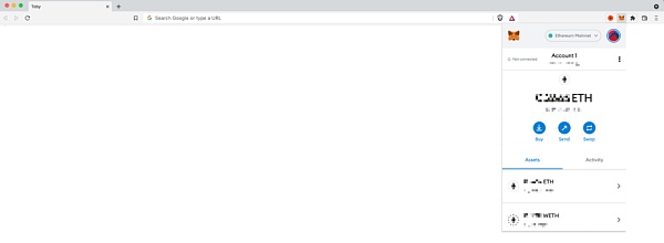 下圖就是 MetaMask 在瀏覽器中的樣子。狐貍圖標位于角落,一旦登錄,用戶就可以訪問一個微型門戶,上面顯示著自己的錢包余額,主界面提供了三個關鍵功能的快速訪問入口:購買(Buy)、發送(Send)以及交換(Swap)。??