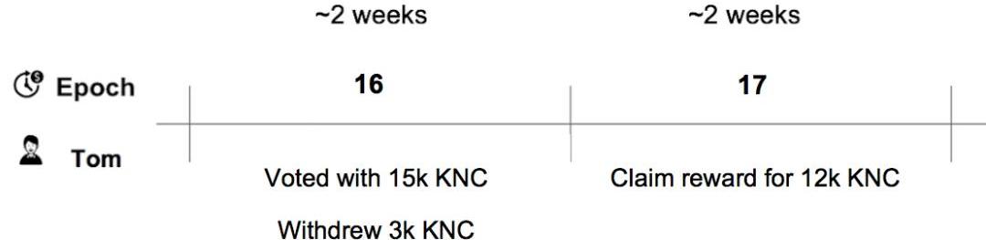 C:撤回KNC質押Tom可以在一個周期的任一時刻撤回其質押。他在該周期的投票權將被計為他撤回質押后擁有的最低金額。例如,在第16周期,Tom在擁有15,000KNC的時候進行了投票,然后在該周期的中途撤回了3,000KNC。雖然他投票時擁有15,000的KNC,但他的投票權將僅計為12,000KNC。因此,在第17周期,他只會獲得12,000KNC對應的獎勵。