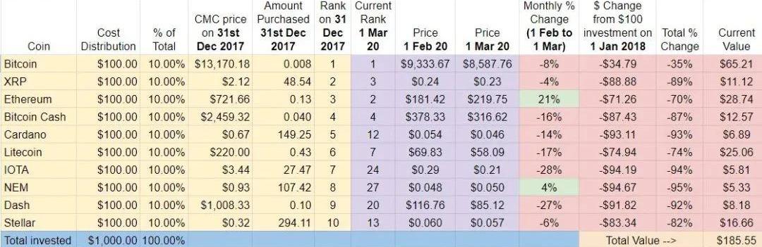 和很多投資市場一樣,加密貨幣市場也是牛短熊長,很多人不信比特幣、不參與加密生態建設,但不妨礙他們來這里賺錢。這個波動巨大的「賭場」上,有人通過大開大合的玩法暴富,破產,也有人試圖通過細水長流的方式,通過時間來分攤買幣的成本。加密貨幣算不算一個好的投資標的?海外一位名為「Joe-M-4」的Reddit網友花了兩年多時間在每年的第一天,按市值前十的幣種分別買入100美金,共計1000美金,進行了一場加密實驗,最終在2018年年末虧了近81%,第二年賺了47.2%,今年2月,他又賺了51%。從慘虧大半到賺一半,加密貨幣的表現實在陰晴不定。