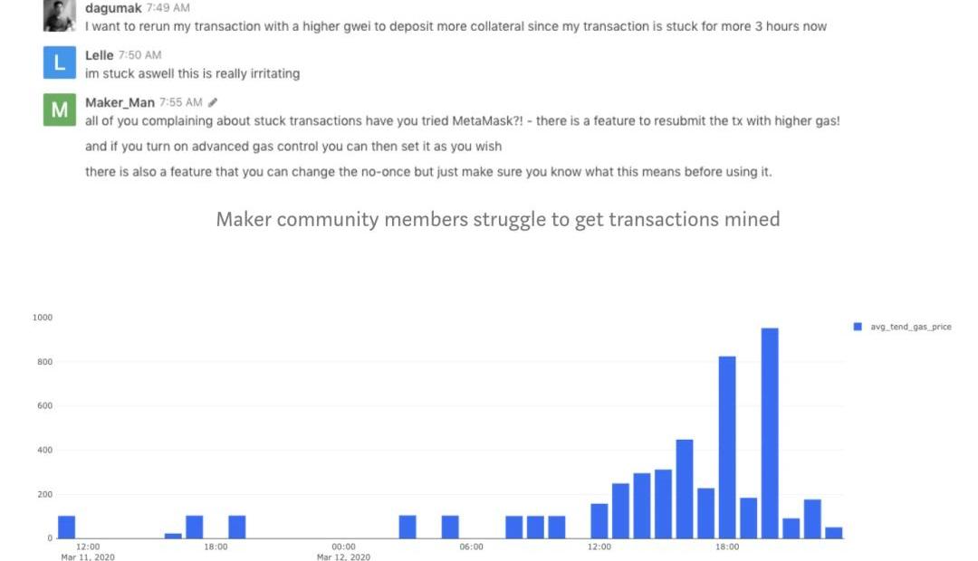 在正常市場條件下,任何理性的參與者看到有0出價競拍者,都會至少出價1美元勝出,拿到一定數量極為便宜的ETH。但在周四下午已經不堪重負的系統中,兩個因素導致系統惡化。區塊鏈網絡擁堵區塊鏈交易帶寬是共享資源,其價格由供求關系決定。周四的網絡擁堵導致Gas價格飆升至平時的10倍以上,造成交易所價格漂移,套利者無法迅速從價格不匹配中進行套利交易。及時進行低價值交易變得不可行。反映到Maker系統中,一些用戶嘗試針對0美元的出價者加價,但由于網絡堵塞而未能及時被區塊記錄,這使得拍賣過早結束。我們可以看到競拍贏家一度平均需要支付1000gwei,或相當于以太坊燃料Gas平常價格的100倍,才能被區塊收錄。網絡擁堵甚至導致普通用戶在界面一遍遍重復提交申請,以保住自己的抵押頭寸。Maker社區成員無法讓以太坊記錄其交易報價。