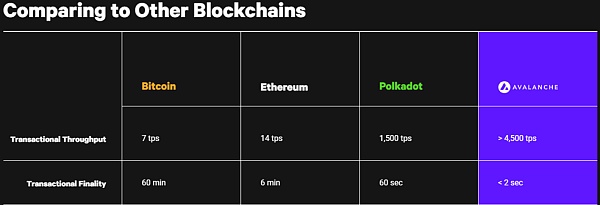Avalanche 的交易吞吐量超過 4,500 tps,交易終結時間不到 2 秒。與其他區塊鏈網絡相比,這非常具有前景。