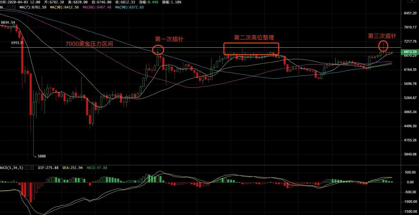 既然是反彈走勢,那么反彈的壓力位在哪里?從這段時間的BTC走勢來看,目前的一個壓力位在7000美金。底部反彈以來,沖擊了3次,第一次是插針,第二次是高位橫盤整理后下跌,這一次也是插針,但短時間內還沒有走出來,因此仍需要等待,來判斷是否有效突破的問題。考慮到上周外部股市收盤后,BTC走了一波獨立行情,今天周五,基本上這周內應該能判斷出這次沖擊7000美金,到底是插針假突破,還是能真突破。