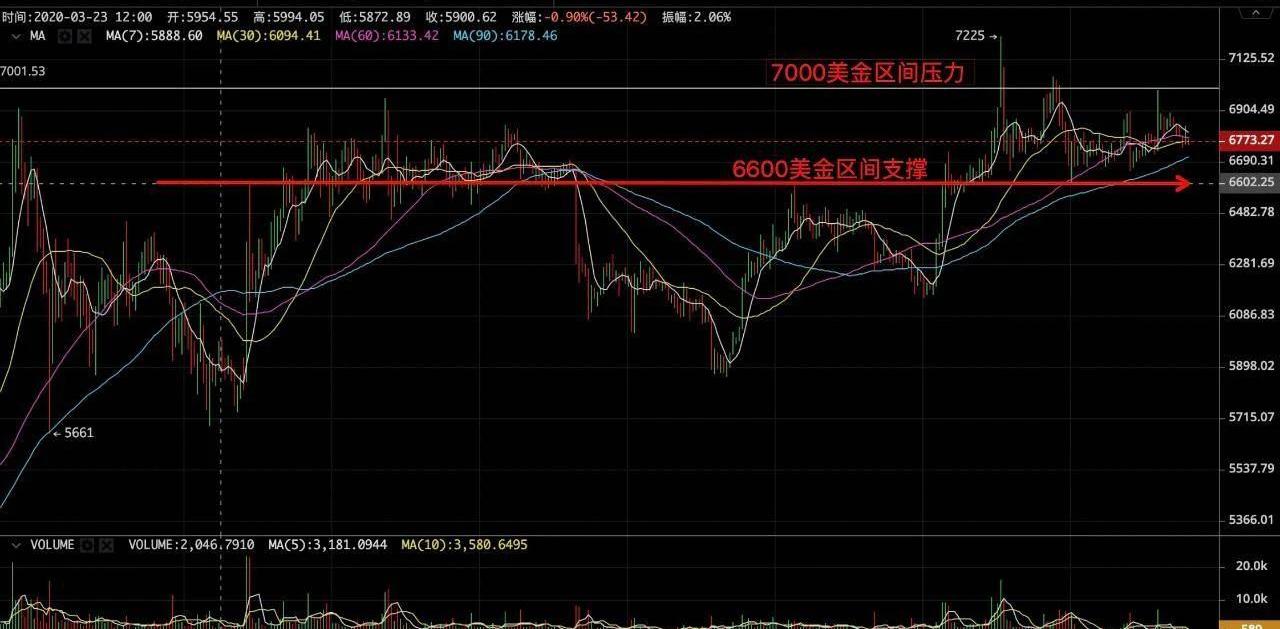 既然是短線博弈,那么短期行情的走勢便是不確定的,沿著7000美金區間上下小幅波動,均是正常的現象,在沒有大量能的參與下,6600-7000美金區間整理的走勢或將延續。我們僅需關注底部6600美金的有效支撐,不破支撐,短線暫時就是安全的。