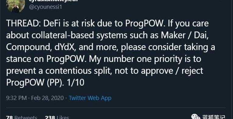 對這種情況的解讀是,ProgPoW爭議很大程度上集中于討論以太坊的權力結構,而不是ProgPoW的技術優點。在很多方面,這次爭議跟比特幣的擴展/SegWit之爭相似,這場爭議持續多年,并最終變成誰來真正控制比特幣的問題。是用戶、礦工還是開發者或經濟節點?而不是聚焦于SegWit有什么技術優勢的問題。這是一件好事。正如斯賓賽·努恩指出的那樣,這是以太坊成熟的跡象,它達到了300億美元網絡的階段。其中超過10億美元鎖定在杠杠、價格敏感的DeFi應用上,并且有重要并行價值依賴于其原語、協議以及人們。