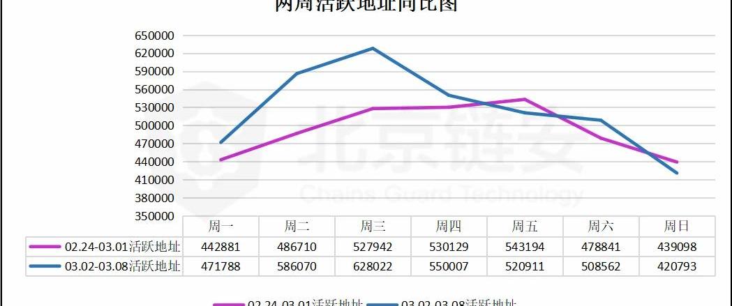 活躍地址數:02.24-03.01:344879503.02-03.08:3686153較之前一周上漲:6.88%詳細數據圖如下: