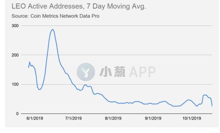 此外LEO的地址活躍度也相當消極,在去年6月份活躍地址數量短暫達到大約300個之后出現了明顯的下降。而在去年10月下旬這個數字甚至下降到了20以下。當時CoinMetrics在報告中指出,對于一個市值接近10億美元的幣種來說,這個地址活躍度處在一個相當低的水準。