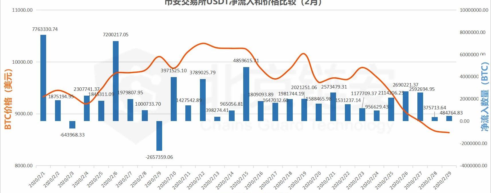 從2020年1月和2月兩個月的凈流入與價格比較來看,在幣價上升階段,幣安的凈流入明顯呈現弱勢,整體體現為比特幣的凈流出狀態。2月,幣安還受到了所謂“丟幣”的謠言影響,一度也造成了短期的比特幣流出,但是很快得以恢復。