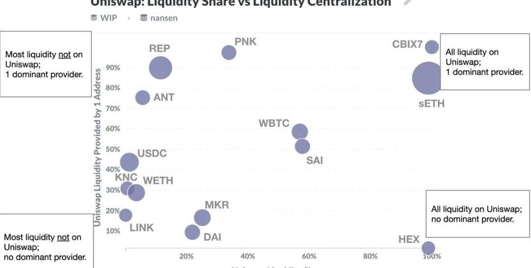 數據顯示,連接Synthetix合成資產和以太坊的sETH所有流動性都依賴于Uniswap但Synthetix的運作模式則全然不同。這個在Uniswap上位居第一流動性的交易對是sETH/ETH,sETH和ETH是兩個完全等值的資產,它存在的理由是什么呢?Synthetix可基于法幣、數字資產和實物商品生成數多種以s打頭合成資產,理論上講,可以在Uniswap基于這些sTokends創建多個不同的基礎交易對池,比如sUSD/DAI交易對、sBTC/WBTC交易對或sMKR/MKR交易對等流動性池。事實上,Uniswap上除了sETH和ETH之外,確實也有sUSD/ETH資金池,但是其流動性為979ETH,僅為sETH/ETH流動性池規模的2%。sETH/ETH占據絕對性流動性規模讓我們看到了流動性的運作規律:流動性會產生更多的流動性。如果說sETH/ETH是一個通行Synthetix的8車道高速公路,那么,sUSD/ETH資金池就是一個非常狹窄的鄉間小路,前者的效率往往高得多。通過sETH/ETH交易池,sETH已成為以太坊與Synthetix所有合成資產之間的交換媒介,Uniswap上的sETH/ETH交易對,成為了以太坊和Synthetix生態系統之間的價值傳輸橋梁。這就是sETH/ETH交易對存在的價值,也是Uniswap能夠提供的獨特價值。獨特的價值意味著非Uniswap不可,任何交易所都無法取代。為什么這么說?假如Synthetix在中心化交易所上架sETH/ETH交易對,一旦這個交易所出現故障,這個聯通以太坊和Synthetix的橋梁就會倒塌。從根本上說,Synthetix是一個靠交易量維持運轉的項目,SNX的回報取決于交易量。如果依靠中心化交易所,出現單點故障,會導致Synthetix成為一個封閉系統,維持Synthetix有機運轉的流動性會馬上陷入枯竭。與之對比,將Uniswap作為基礎架構是更好的選擇,Uniswap是完全自動化的流動性智能合約控制,完全由計算機控制,任何人都無法控制Uniswap上的交易所,只要以太坊不出問題,Uniswap上的交易所基本上能保證正常運行。不僅如此,由于Uniswap是一個無需信任也無需許可的基礎架構,創建流動性池的各方完全可根據自身利益來增加激勵或操縱市場。在這一點上,Synthetix也是一個值得一提的案例。為了鼓勵大家在Uniswap提供流動性,Synthetix會將原生代幣SNX的通脹供應的一部分獎勵分配給在Uniswap的sETH/ETH流動資金池中作出貢獻的人。結果來看,效果也很不錯,Synthetix的sETH/ETH資金池也是目前為止最大的資金池之一。無獨有偶,受到合成資產發行平臺Synthetix激勵模式的啟發,房產代幣化平臺RealT也在Uniswap上為第三期房產項目啟動了激勵計劃,將房產租金收入分配給流動性提供者。與Synthetix不同的是,RealT是需要許可的代幣化房地產投資平臺,因此流動性會有上限限制。由于目前整體流動性指標來看低于預期水平,RealT團隊計劃在RealTv2版本中,將所有的RealToken放入同一個市場,從而激發更多的流動性,該模式同樣受到Synthetix的sETH/ETH交易對啟發。房地產是世界上流動性最差的資產類別之一,Uniswap為RealT的房產投資者提供了流動性資金池,并確保投資者可以在任何時間清算頭寸,這點再次可以明證,去中心化金融內含的自動化調節機制的巨大魅力。Uniswap交易市場亦可充當去中心化預言機