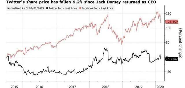 同期對比Facebook和Twitter,則更顯示出領導力的差距。自2015年7月Dorsey出任TwitterCEO以來,該公司的股價已下跌6.2%,而在扎克伯克的帶領下,同期的Facebook的股價已上漲121%以上。