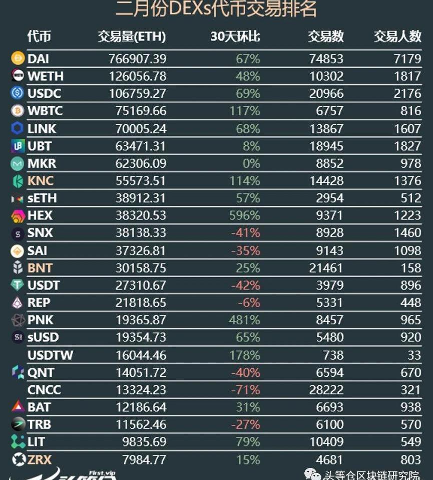 注:交易額通過智能合約統計,如果一個交易在Kyber上完成,而流動性來自Uniswap或Oasis,那么交易會被統計兩次。整個二月份,統計中的DEXs總交易額為4.77億美元,較一月份增長101.9%,這一方面得益于ETH價格的增長,另一方面得益于交易人數的增長。