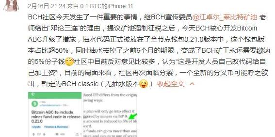 圖片來源:江卓爾微博評論而集中了大多數BCH開發者和核心人員的國外社區,則顯得更加戲劇化。1月23日,也就是BCH礦工捐贈計劃發出的次日,BCH的ABC團隊首席開發者AmaurySéchet就在read.cash上發文,為捐贈計劃站臺,他表示這項計劃醞釀已久,團隊運作需要資金支持,澄清這并不是所謂的“強制繳納的礦工稅”。更值得注意的是,他認為只要捐贈基金能夠透明化就沒有問題,甚至毛遂自薦,認為他自己和以BCH為中心開發的輕錢包ElectronCash的首席開發者JonaldFyookball有資格來控制這個基金。隨后,他提到的這位JonaldFyookball也在read.cash上發文,同樣表示這將有利于團隊和礦工們,之前就已經嘗試過很多關于開發資金的措施,但都沒有奏效,這一次將是一個為期六個月的短期嘗試,將在接下來的BCH協議中進行升級。