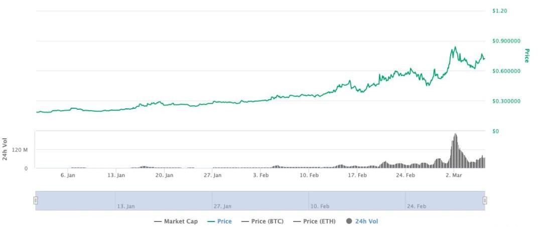 KNC價格的增長離不開利好消息的推動:2月20日,Coinbase透出消息即將上線KNC,2月28日,Kyber官方宣布正式上線CoinbasePro,受此利好消息的帶動,KNC價格出現短時上漲,3月2日漲至0.84USDT高點,與年初0.18USDT的價格相比,KNC漲幅超400%。