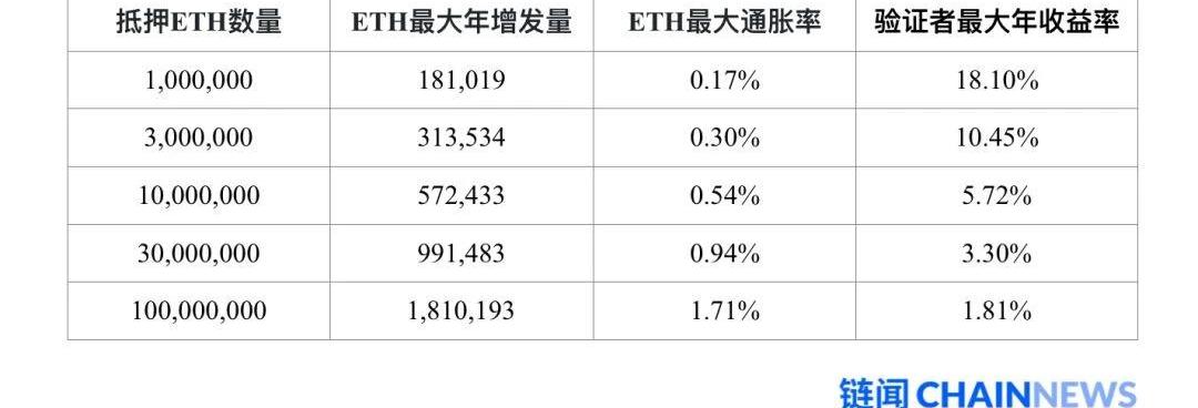 區塊鏈項目市值和開發者數量,數據來源:ElectricCapital參與Staking的收益對于采用PoS共識機制的公鏈,用戶參與Staking的代幣數量越多,作惡者的作惡成本就越高,整個網絡就會越安全。對于以太坊2.0也是如此,生態中的驗證者越多,抵押的ETH數量越多,以太坊就會越安全。以太坊2.0的出塊獎勵是促使用戶參與Staking的動力。以太坊會通過出塊獎勵的方式增發代幣,在PoW共識機制階段,普通用戶沒有能力自己參與挖礦,持幣用戶的利益會因ETH增發受到損失;采用PoS共識機制后,普通用戶可以參與Staking,可以抵消ETH增發帶來的損失。為了吸引更多的用戶參與Staking,以太坊2.0將驗證者的年收益率與抵押的ETH數量掛鉤。當系統中抵押的ETH數量較少時,驗證者的年收益率會很高,隨著抵押的ETH數量增多,驗證者的年收益率會降低。下表是EthHub給出的ETH年增發量,表中給出的增發量是最大值,如果驗證者受到懲罰的情況出現,實際增發量會比這個數據小。