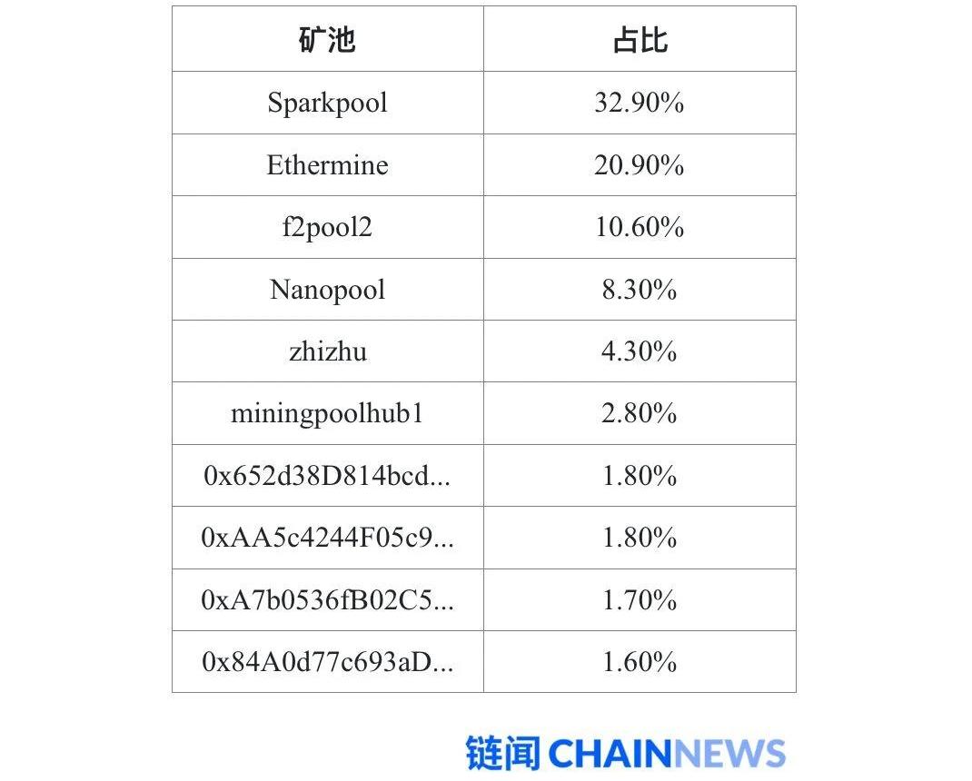 比特幣算力分布圖,數據來源:btc.com,2020年1月22日從上圖中可以看出,比特幣前十大礦池的算力占比之和超過全網算力的90%,中心化的程度非常高,用戶使用個人電腦就可以挖比特幣的景象再也不可能出現。與比特幣一樣,以太坊上線時也采用了PoW共識機制。雖然以太坊的挖礦算法中加入了抗ASIC礦機的設計,但是目前以太坊的中心化程度也非常高。以下的圖和表分別表示以太坊的算力分布情況和前十大礦池的算力占比,可以看出,以太坊前十大礦池的算力占比之和也接近全網算力的90%,前五大礦池的算力占比之和達到77%。