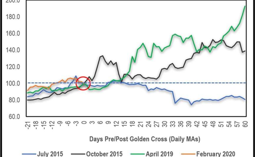 圖4:2015年10月至11月BTC價格日線圖vsMA50,200(綠/紫)-Tradingview以上幾次的比特幣黃金交叉形成前后的價格上下幅度可綜合至下圖,如果我們以金叉形成后的60日回報率計算,之前三次事件中共有兩次為正一次為負。金叉后60日的上漲幅度雖然值得期待,但當中的回調幅度也較為巨大。同時我們注意到,之前三次金叉形成后的兩周,幣價均回到了金叉形成日的附近,但在之間的兩周中幣價起伏巨大。