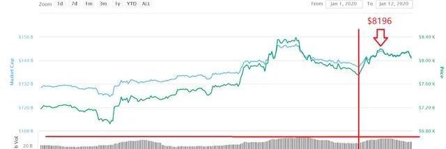 上圖為BSV近10天的走勢,其中豎線所標示的位置為BSV爆漲的時間點,大概在1月11日。其價格最高漲至172美元。其中橫線所標示的為BSV在爆漲前的最高成交量。從成交量可以看到,爆漲期間的成交量起碼都達到了平時成交量的2倍甚至3倍。我們再看看比特幣的價格走勢圖: