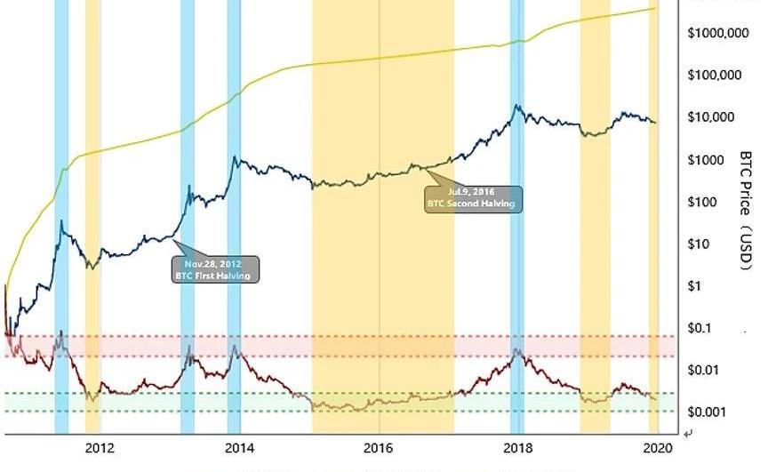 下面將通過分析三大技術指標:移動平均、奧特曼模型和儲備風險模型,讓你徹底了解購買比特幣的時機是否合適。移動平均線:是指比特幣價格趨勢的平均值。該模型更傾向于相信歷史價格對未來趨勢的影響更大。對于短期、中期和長期投資,平均市盈率通常超過5天/10天;30天/60天;120天/240天。在這里,我們將使用比特幣兩年的MA和MA*5指標的半周期作為分析工具,主要是指比特幣可能產生更大利潤的買賣時期。下圖顯示,當價格跌破2年期MA時,購買比特幣將產生超額回報;當價格突破2年期MAx5時,將呈現最暢銷的時期。隨著比特幣減半,市場周期波動明顯:暴漲、回調、市場參與者過度興奮導致的盤整和價格過度收縮。從圖2可以看出,綠化面積大約在一年前減半。這同樣適用于第三次減半,即購買比特幣的最佳時間是2018年12月至2019年4月。我們可能進入第二個綠色區域。