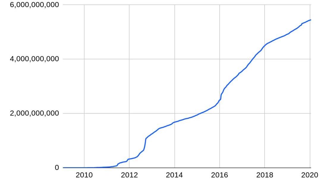 圖4—BTC交易輸出數量與BTC價格,資料來源:BitMEX研究、BTC區塊鏈、Coinmarketcap提供BTC價格下面的圖5和圖6顯示了BTC輸出的總幣值及其如何隨著時間的增長變化。約13億個輸出支出了約55億BTC。根據支出發生時的BTC現貨價格,這可能代表支出了超過12萬億美元。