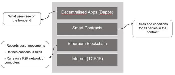 Dapps和區塊鏈通過智能合約連接,上圖顯示了Dapps、智能合約、區塊鏈和Internet層之間的交易流程。Dapps和智能合約將所有各方直接連接到交易,這個過程無需中介參與,從而使雙方都可以控制他們共享的數據。據一個簡單的例子:Tom想把他的公寓租給Sam,此時有一個智能合約,Sam和Tom需要滿足的一組條件才能使租賃協議生效。如果雙方都符合條件,則Tom會收到他的租金押金,并且觸發智能合約會激活一個數字密碼箱,因此Tom可以訪問公寓的鑰匙。去中心化金融
