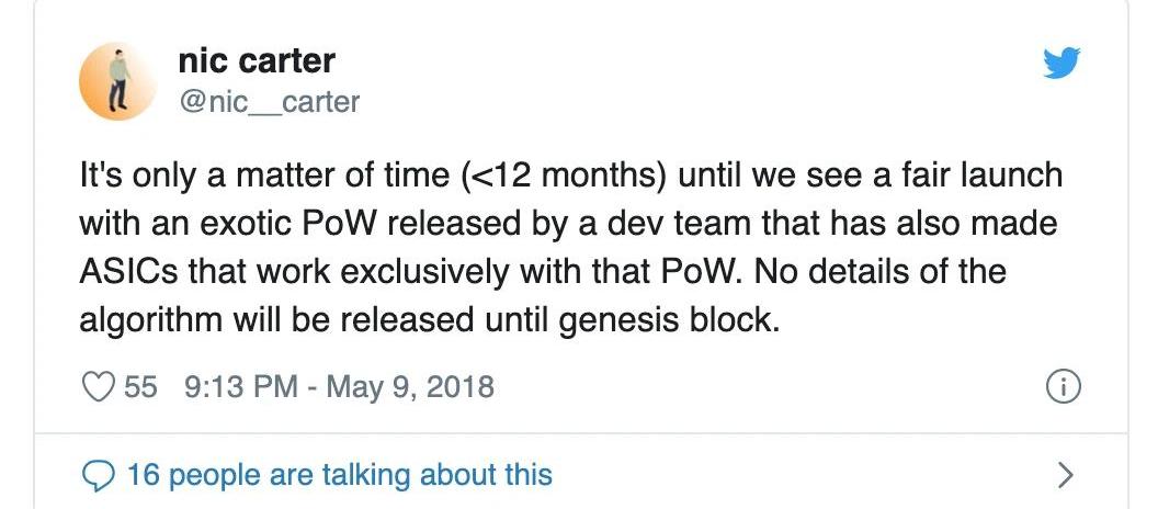 @nic__carter:在未來一段時間,我們遲早會看到,某開發團隊宣布一個PoW型的公平啟動的項目,而且該團隊會推出專為該項目的PoW算法挖礦的ASIC芯片。在創世區塊之前,該算法的細節不會公布出來。大概一個月后,Obelisk公布了提供某種商業服務的計劃書,名為Launchpad,它方便那些使用專門定制的ASIC的PoW型啟動。