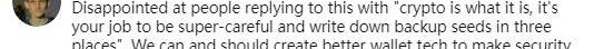 以太坊創始人Vitalik也發表了對該事件的評論,不過與其他批評和指責的聲音不同,Vitalik顯得有些失望。他表示對看到這些強調“加密貨幣就是這樣的,你有責任牢記助記詞并多備份幾份”的言論感覺十分悲哀,“我們應該將錢包做的更好更易用,而不應讓用戶自己去保證其安全性。”對此幣安交易所創始人趙長鵬也給出了同樣的看法,他表示很多硬核用戶都不斷強調自己保存好私鑰,但事實上大量普通用戶連自己的密碼也保存不好,他認為對于很多人來說,一個值得信任的中心化交易所十分必要,同時趙長鵬表示將要開始關注錢包賽道。作為數字資產入口級產品,從業者對錢包領域的探索從未停止。原比特幣中國CEO李啟元在接受PANews采訪時就曾表示了他對錢包賽道的失望之心,因此創建了Ballet“預設私鑰”輕型硬件錢包。為了解決用戶保存助記詞的痛點,cobo和比特派等都推出了金屬助記詞版。也有如starteos錢包支持用戶將私鑰通過藍牙存儲在特質的硬件盒子中,通過該硬件實現一鍵導入。但實際情況是,無論錢包創業者如何“改良”自身產品,其服務對象始終是已經有一定認知能力的持幣者,場外用戶及新進用戶的教育成本十分高昂。在所有HODLER的認知中,比特幣是無主權的,是自由的,是一座通往天際的巴別塔,但在圍城之外的人,卻因為“私鑰”“助記詞”被束縛的難以呼吸,不斷有人提醒著他們額外的責任,加密世界的入口亟待加上更低門檻的安全門。