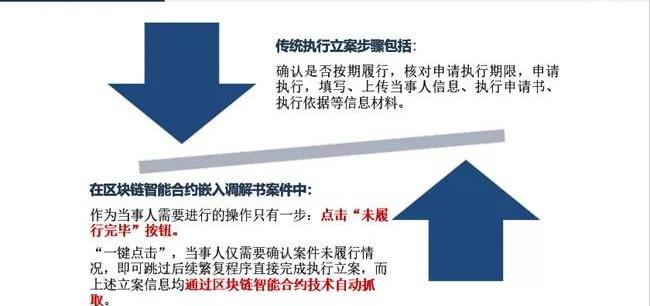 傳統執行立案步驟包括確認是否按期履行,核對申請執行期限,申請執行,并要填寫、上傳各類信息材料,步驟繁復,當事人需填寫及提交的材料也多;對比本案,使用區塊鏈智能合約嵌入調解書中,當事人只需根據案件的履行情況相應點擊,即可跳過后續繁復程序直接完成執行立案,而立案信息均通過區塊鏈智能合約自動抓取。我們先簡單了解下智能合約,智能合約的概念是1994年尼克·薩博首次提出,是一套以數字形式定義的承諾,包括合約參與方可以在上面執行這些承諾的協議。智能合約包括去中心化、自治、自足三個要素,自治是指合約自動運行,不需要它的發起者進行任何干預。
