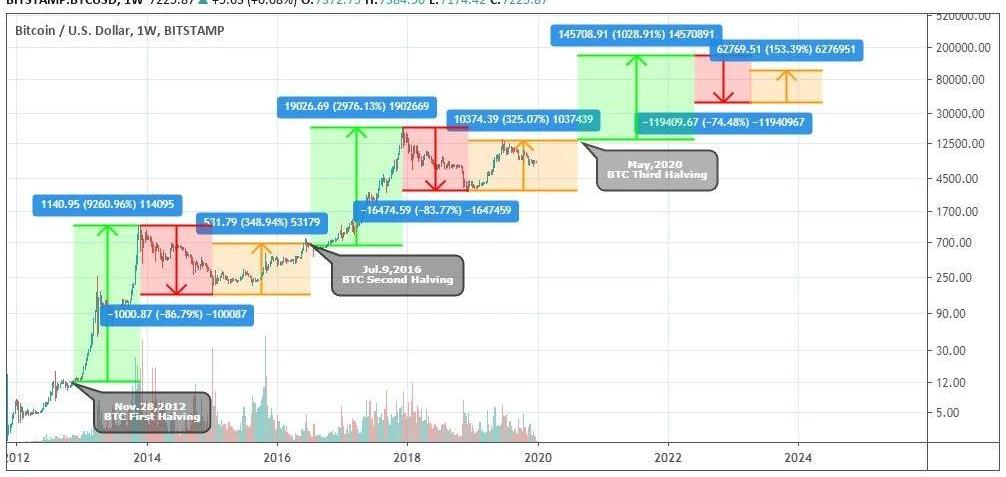 XRP/HKD-2.95%當前,大部分人都認為比特幣減半必將帶來大牛市。這部分人主要是從之前兩次減半走勢出發的經驗主義。從下圖可以看出,比特幣之前曾在2012年11月28日及2016年7月9日,發生過兩次減半。第一次減半后歷經367天刷新歷史最高價,幣價飆升9260%。第二次減半后歷經526天再次刷新歷史最高價,幣價飆升2976%。因此,即使相對于前兩次減半周期,2020年的比特幣市值已經空前龐大、衍生品市場逐步繁榮等因素的出現都將導致比特幣波動率逐步趨穩,但仍然有不少人認為,第三次減半必定會有10倍以上的漲幅。