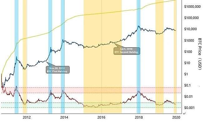 繪圖如下所示,從圖中可以看出,當價格跌至2年均線以下時,購買比特幣會產生超額收益;當價格超過2年均線x5時為出售比特幣的最佳時期。至于為何會產生這樣明顯的上車下車機會,主要原因如上圖所示,以比特幣減半為軸心,其會經歷明顯的市場周期波動——暴漲、回調、盤整,主要由市場參與者過度興奮導致價格過度擴張和價格過度收縮而過于悲觀造成。從圖2可以看出,綠色洼地均處于減半前的一年左右。2020年減半的最佳入場時機則為2018年12月-2019年4月期間。而當前有機會產生并進入第二個綠色洼地。