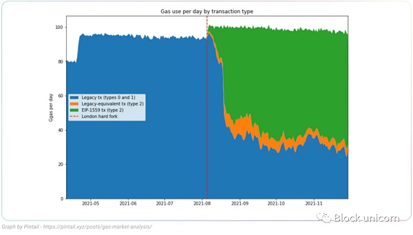 該圖顯示了以太坊“Type 2”(使用 EIP-1559 的 tx)和“Legacy”交易的細分。到 2021 年底,以太坊上約 35% 的交易仍在使用“遺留”交易。然而,即使是遺留交易也可以從 EIP-1559 中受益,因為它改進了 gas 估算的生成方式。