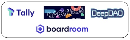 Tally 和 Boardroom 是前端治理工具。其中,成員可以對提案進行投票,以及查看選民資料和治理活動信息。理想情況下,Etherscan 等查詢工具會演化為一種治理工具,為人們提供有意義的信息,例如,選民與候選人的委托關系、定性數據(解釋選民投票方式的來源和依據)以及社區對某些提案的看法。