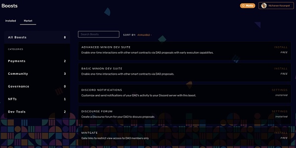 過去一年中,基于 Moloch 框架的 DAO 數量激增,DAOHaus?一直是背后的主要推動力。它作為一個前端平臺,除了可以允許用戶部署 DAO 并進行提案投票之外,還有一套名為 Boosts 的附加組件,可以將 DAO 活動集成到 Discord、Discourse、Gnosis Safe 等外部應用程序中,對任意合約請求進行提案投票。