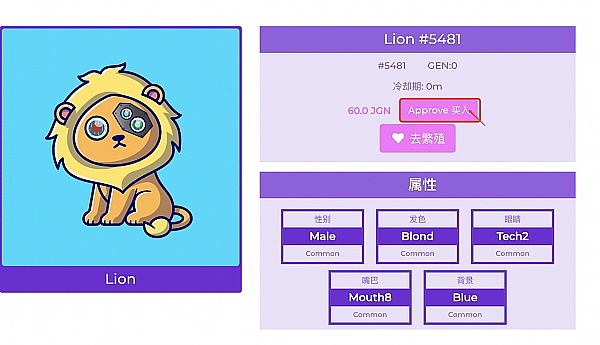 三、選擇購買最喜歡且最便宜的獅子!點擊你選中的獅子,進入批準頁面,并點擊“Approve買入