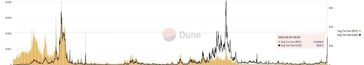 我們知道,比特幣礦工收入來自區塊獎勵和交易費用,自從BRC-20迎來爆發之后,比特幣每筆平均交易費用從5月初就出現大幅增長,手續費收入更是從兩個月前的0.19BTC上升到當前的4.85BTC,提升了近25倍。DuneAnalytics數據顯示,截至本文撰寫時Ordinals協議銘文產生的總費用已經達到863.9817BTC,其中99.5%來自BRC-20。